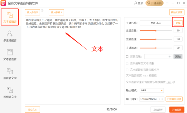 (1)首先打开金舟文字语音转换软件,先点击左侧的[文字转语音]按钮,将需要转换为小孩语音的文字粘贴到下图的文本框中,之后我们点击右侧主播菜单栏旁边的[更换]。