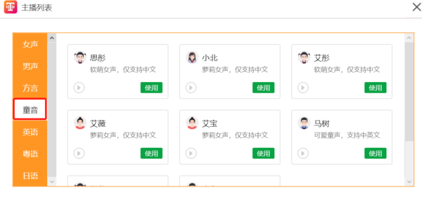 (2)之后会弹出一个[主播列表]界面,之后我们点击[童音]就可以看到多达8位风格迥异的儿童AI主播配音了,男孩女孩、萝莉软萌、可爱童声都一应俱全,选择一个你喜欢的风格,点击[使用]即可。