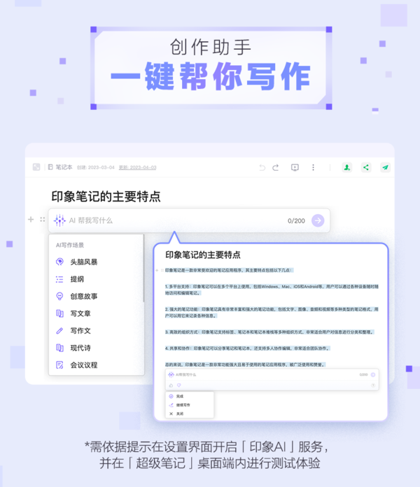 开启印象AI后,用户可以在超级笔记模块内,体验到印象笔记根据用户自然语言一键生成的文章的神奇功能。