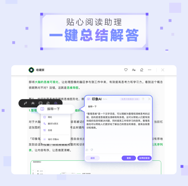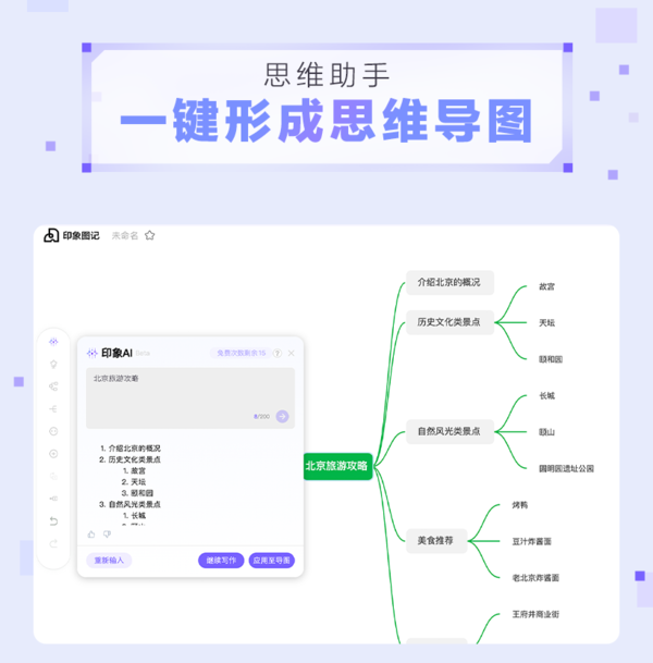 在印象图记中,印象AI可以根据用户笔记内容,一键生成思维导图,让你轻松解放双手。