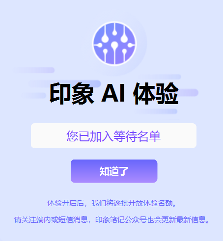 3、预约成功后,待印象笔记官方审核,审核成功后会通过客户端内、短信、公众号等渠道通知到用户。最重要的是获得测试资格的用户“可获得全部产品的「印象AI」能力的体验资格”。