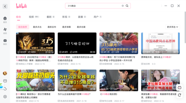 下载并安装哔哩哔哩电脑版,在哔哩哔哩搜索栏中搜索“315晚会”后点击搜索即可查看到关于今年315晚会的部分电视台回放,及相关博主的讨论。