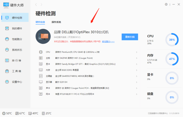 小编之后又下载了【Windows优化大师】,在Windows优化大师中找到【硬件检测】,打开硬件大师,检测后得出以下结果: