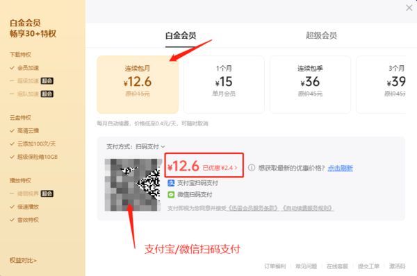 以迅雷白金会员为例(迅雷超级会员开通方法同),我们先选择开通迅雷会员的时长(月/季/年),之后在界面下方,会显示出我们开通会员的价格;接着,我们用支付宝/微信扫描二维码,即可进行支付。
