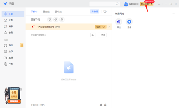 我们打开迅雷,之后点击【开通会员】(一些用户没开通过迅雷会员,会显示【新人优惠开通】),进入迅雷会员开通界面。