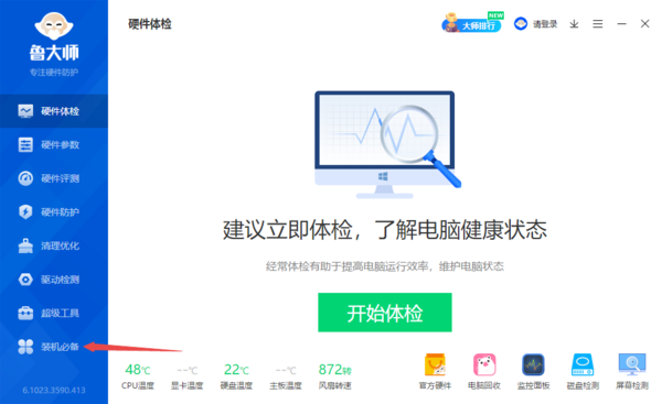 1、启动电脑版鲁大师,然后找到左侧的【装机必备】选项并点击它。