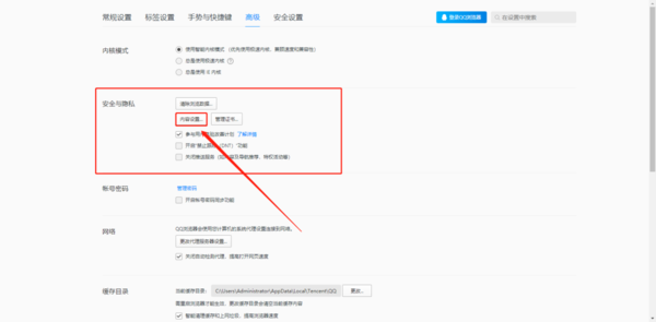 第五步:在高级设置页面,找到“安全与隐私”栏,点击右侧的“内容设置”。