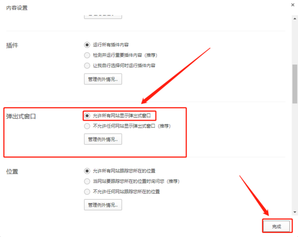第六步:在弹出的“内容设置”界面,找到“弹出式窗口”栏,勾选“允许所有网站显示弹出式窗口”选项,勾选好后,单击“完成”。