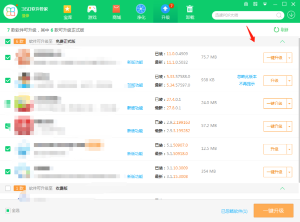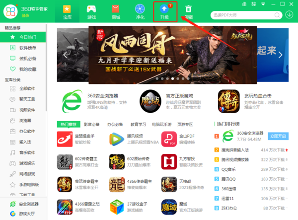 1、打开360软件管家进入界面后点击上方的【升级】选项;