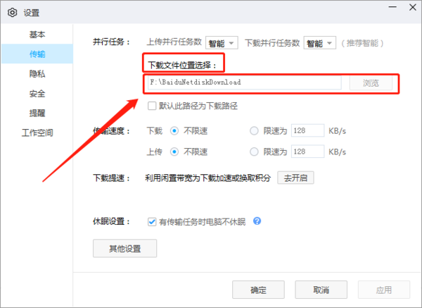 第五步:在传输设置界面右侧,“下载文件位置选择”一栏下方,就是百度网盘下载文件的下载路径了。
