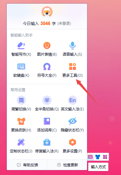 第一步,找到电脑上搜狗输入法的状态栏,然后按下鼠标右键,接着在弹出的选项中,选择【更多工具】选项。
