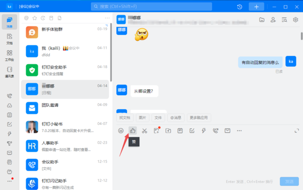 第三步,紧接着,在聊天的输入框中,我们可以看到一个【大拇指】的图标,它就是点【赞】的图标。点击这个大拇指图标,即可进行点赞。