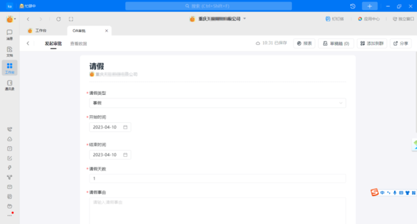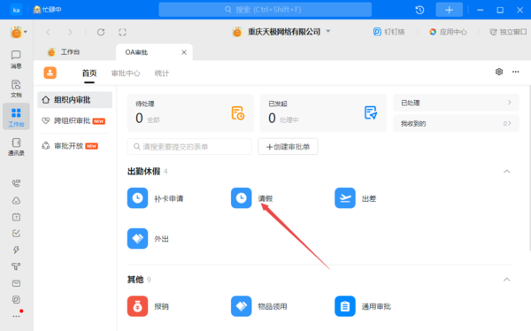根据查找到的资料来看,电脑端钉钉找不到请假入口可能是当前账号所在的位置不对,此时我们将自己账号的工作台切换到公司架构中,一般就可以看到【OA审批】的请假模块了,进入到该模块我们便可以看到请假功能了。