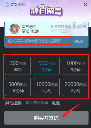 在该界面,我们可以输入自己想留言的内容,并且选择醒目留言悬挂时长(悬挂时间越长,需要的电池也就越多);在确定上述项后,点击【购买并发送】即可。