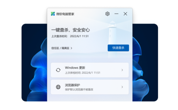 微软电脑管家首要保证用户的电脑安全情况,能充分调动微软自主研发的Windows?Defender杀毒引擎,出于最纯粹的目的去保护用户正常使用,做到客观不误杀并及时筛查出电脑病毒。