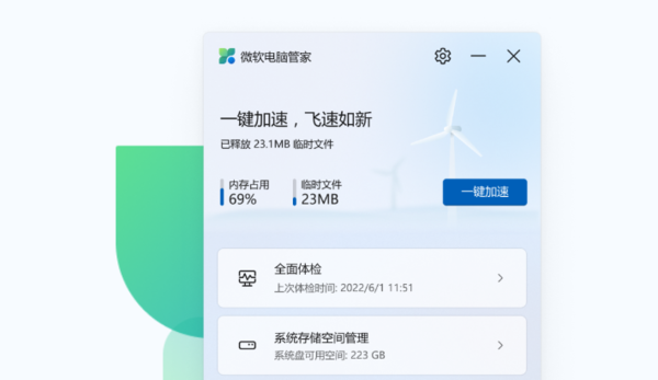 界面简洁、操作流畅是微软电脑管家重要的优点,其软件本身在开启时没有冗余的内存占用,其对系统速度的影响几乎可以忽略不计,同时优质的软件底层设计也让其在进行各项功能操作时飞速运行,减少用户的等待时间。
