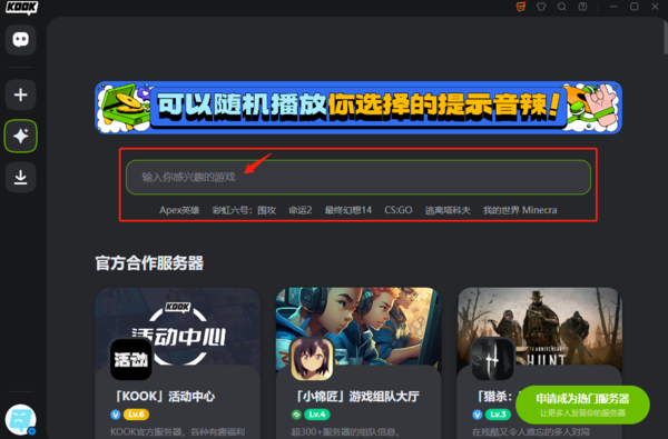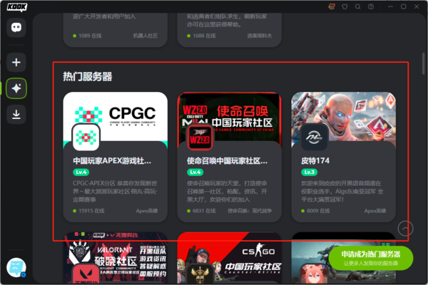 1、界面搜索栏加入。当我们打开kook之后,即可看到语音服务器的搜索栏,然后我们可以直接在上面搜索服务器即可;注意:该方式是需要我们根据服务器关键词进行搜索,比如我们想找CSGO相关的语音服务器,可以直接输入【CSGO】,就能找到几乎所有关于CSGO的语音服务器了。