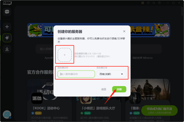 三、之后也是kook服务器创建的关键一步——个性化设置;在此我们需要设定好服务器的图标、名称,以及所属区域,在选好之后,点击【创建】,kook即为我们生成属于我们自己的语音服务器了。
