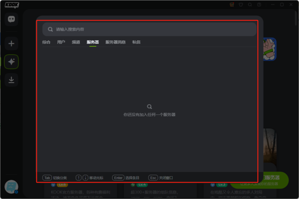 3、搜索界面加入。除此之外,我们还可以点击kook界面右上角【放大镜】图标,在搜索界面搜索、加入服务器(该方式是以服务器号进行搜索)。