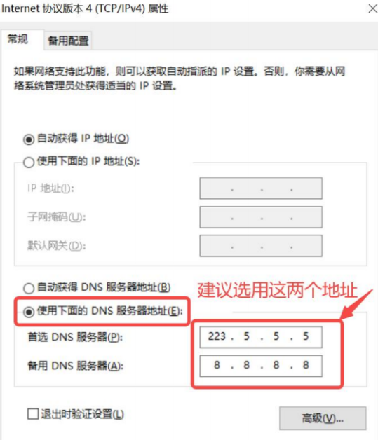 5、选择【使用下面的DNS服务器地址】后输入图中地址,之后在尝试一下能否正常连接或认证。
