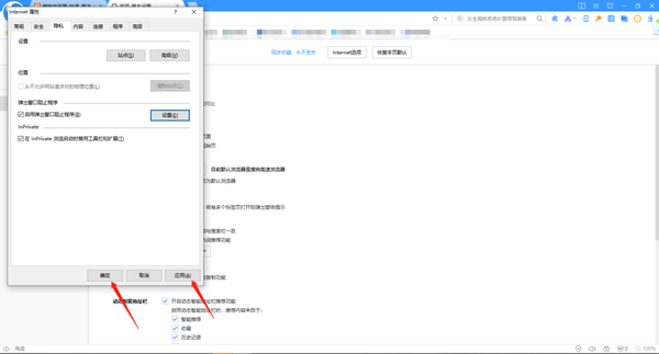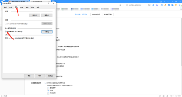 2、进入后点击【隐私】,勾选【启用弹出窗口阻止程序】。