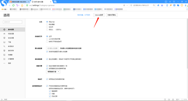 1、打开搜狗浏览器,点击【菜单】,进入后点击【选项】。进入【选项】界面后,点击上方【Internet选项】。