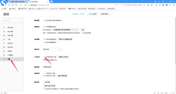 2、进入【选项】界面后,选择【高级】进入,找到【广告过滤】,勾选【启动弹出窗口拦截】即可。