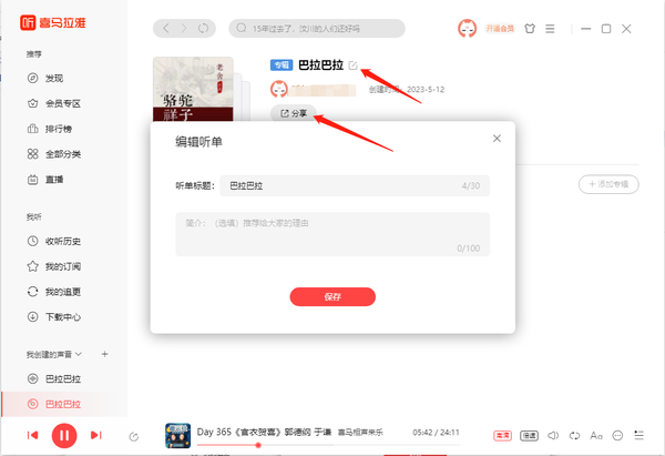 4、点击听单后面的【编辑】,即可对听单进行重命名,以及编辑推荐给大家的理由。同时可以将该听单分享给他人。