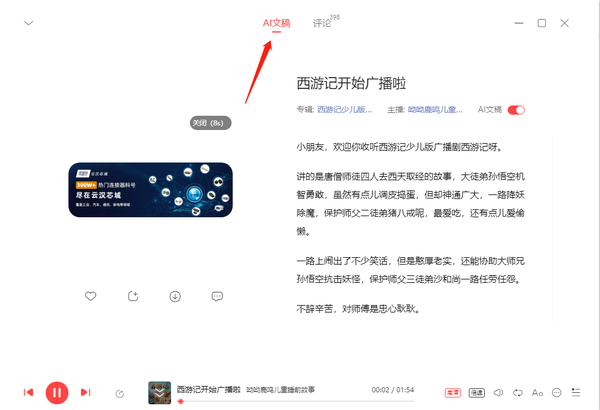 2、在弹出的界面中点击【AI文稿】,即可边听音频边看文字稿,但不是所有的音频节目都提供有文字稿的。
