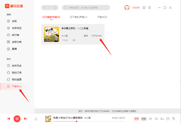 3、下载过程中,我们可以点击左侧【下载中心】,在该界面可以查看作品下载进度;下载之后,我们就可以在上方点击【已下载的声音】,鼠标移入点击【打开文件夹】,就可以在本地找到下载的音频。