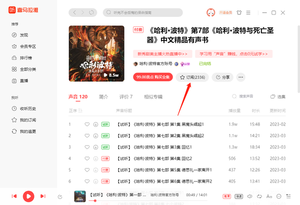 1、打开喜马拉雅,找到你想要订阅的书籍专辑,点击【订阅】即可。