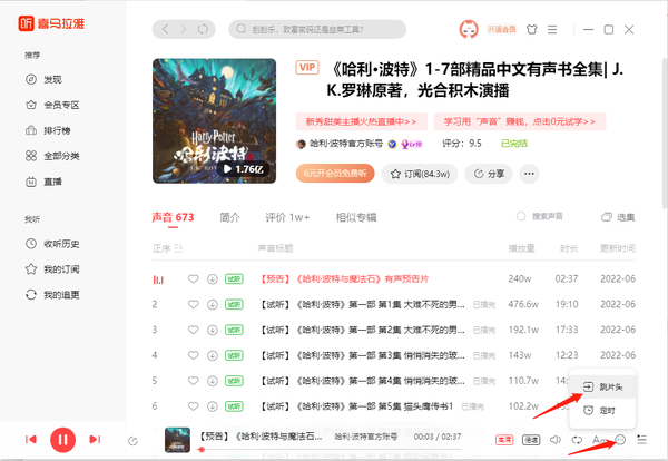 2、可以看到有跳过片头和跳过片尾这两个可以拖拽的选项,拖拽代表着跳过的秒数,我们根据需要自行选择即可。另外可以开启【智能跳过片头/片尾】的选项,即可自动判断该音频的所需要跳过的片头片尾时长。
