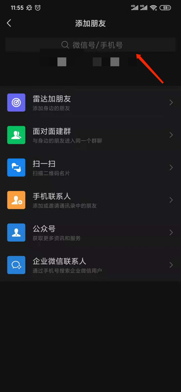 第三步,输入朋友的微信号或手机号(QQ号也可),再点击搜索;