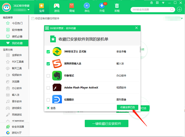 3、勾选要收藏的软件,点击【收藏全部已选】即可。