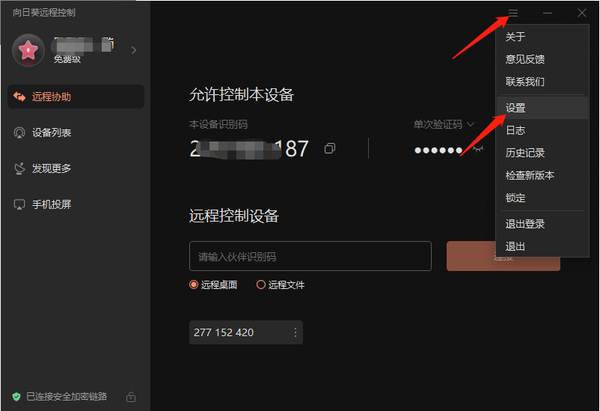 1、进入向日葵远程控制,点击右上角【菜单】,选择【设置】进入。