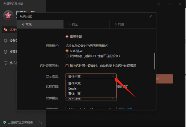 进入向日葵远程控制,点击右上角【菜单】,选择【设置】进入。进入【设置】界面后,选择【常规】,找到【显示语言】,可以切换语言。