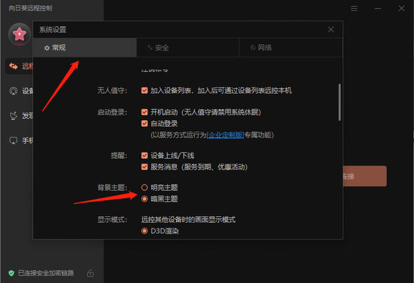 进入向日葵远程控制,点击右上角【菜单】,选择【设置】进入。进入【设置】界面后,选择【常规】,找到【背景主题】,可以切换【明亮主题】和【暗黑主题】。