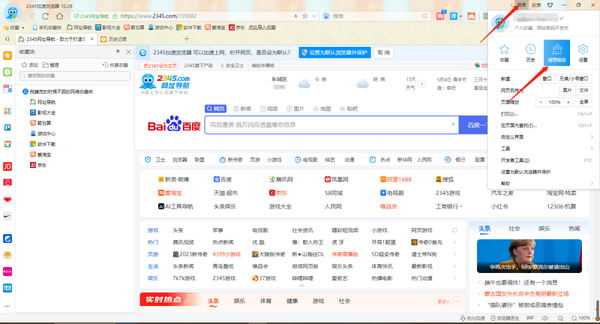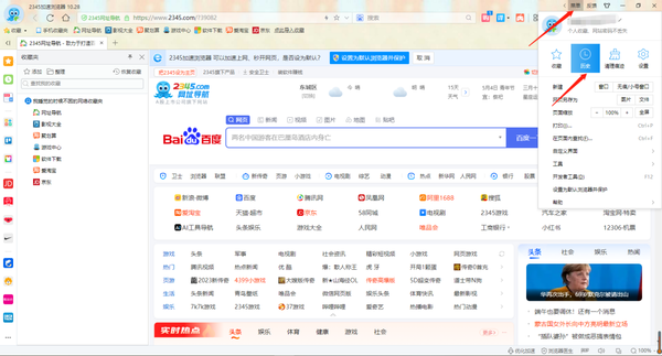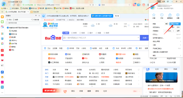 1、打开2345加速浏览器,点击右上角的【菜单】,选择【无痕/小号窗口】进入。