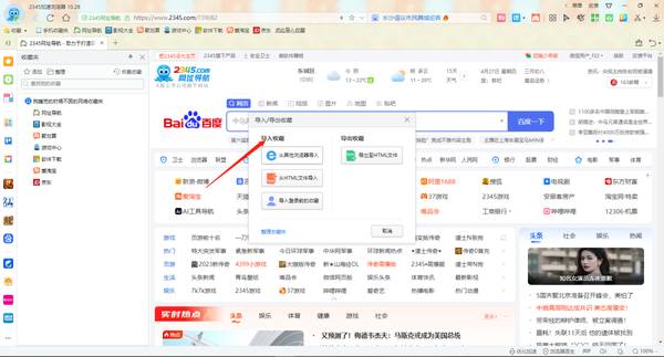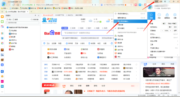 1、打开2345浏览器,点击右上角的【菜单】,选择【收藏】,再选择【导入导出收藏夹】。