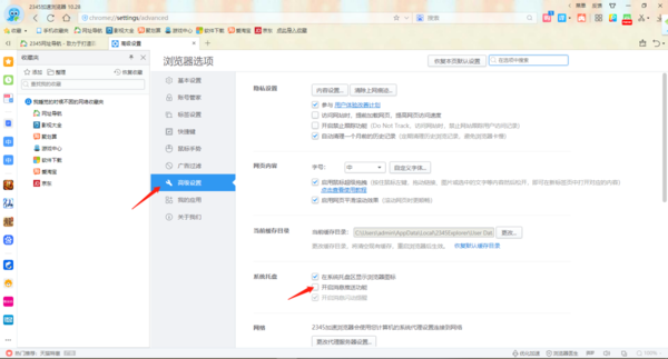 2、在设置界面左侧找到高级设置,在系统托盘一栏中,取消勾选开启消息推送功能,重新打开浏览器就可以关闭消息推送了。