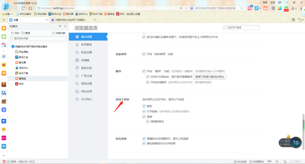 1、划词工具条:在设置界面左侧点击基本设置,找到划词工具条进行勾选。当选中网页文字时,该功能可以实现快速复制搜索,以及打开链接。