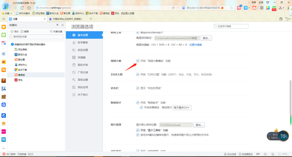 3、视频小窗:在设置界面左侧点击基本设置,勾选开启“视频小窗播放”功能。该功能可以实现一边观看视频一边浏览网页,还可以移动视频位置。