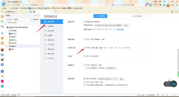2、在设置界面左侧点击基本设置,找到2345大图,勾选开启“2345大图”功能即可。
