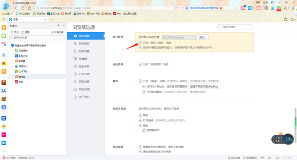 2、图片工具条:在设置界面左侧点击基本设置,找到图片管理,勾选开启“图片工具条”功能。当鼠标移入时网页图片时,该功能可以实现快速保存复制,以及设为桌面。