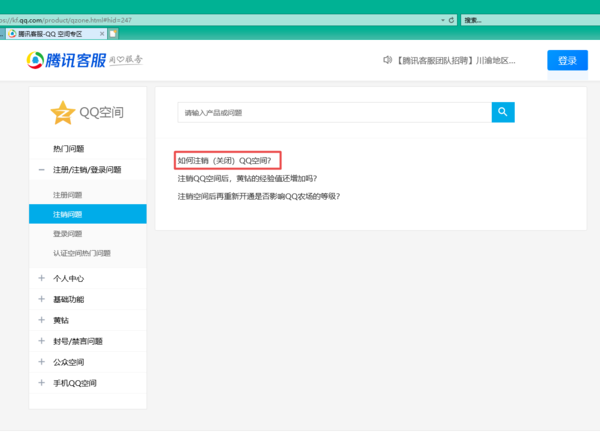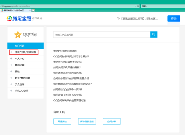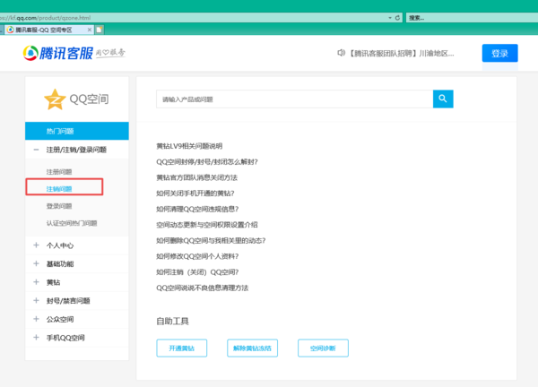 第三步,接着我们就会进入到QQ空间的帮助中心界面,在界面的左侧,找到【注册/注销/登录问题】选项,并点击打开。