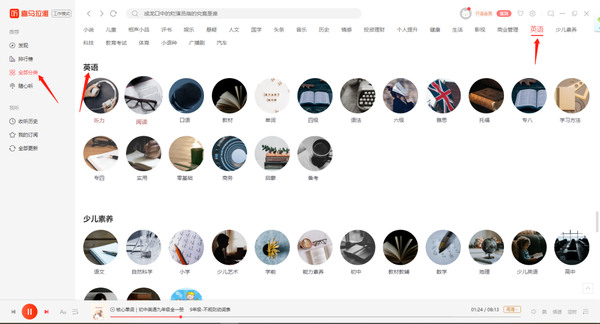 1、首先进入喜马拉雅主界面,点击全部分类,找到英语分栏,按照自己的需求进行选择,不管是学习四六级雅思还是零基础启蒙,不管是练习听力还是口语,都能找到适合自己的分类。里面会有很多不同的音频素材,可以选择自己感兴趣的专辑。