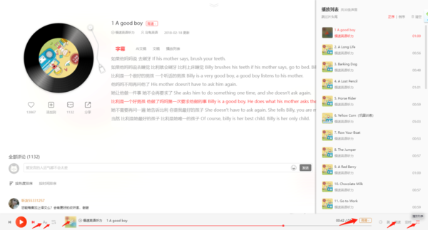 2、选择好自己感兴趣的专辑之后,点击进度条旁边的封面图会进入到字幕状态,以及可以调整语速、字体大小、播放状态、音质、该专辑播放列表等。