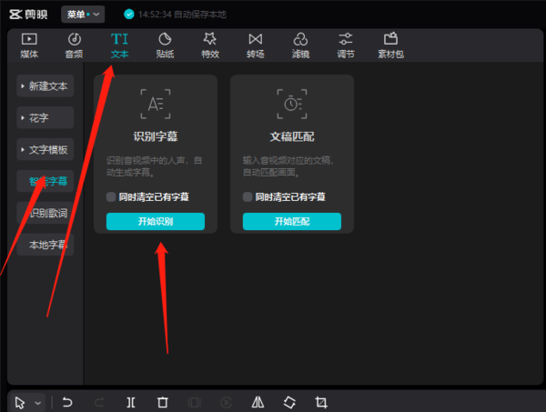 大家在【文本】一栏中选择【智能字幕】,找到【识别字幕】,选中要识别字幕的音视频素材,点击【开始识别】即可。