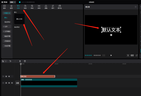3、将素材拖拽添加至下方的轨道中,点击上方【文本】,添加文本至轨道中,在视频预览处编辑文字;