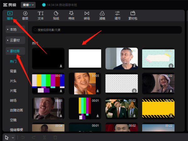 2、进入创作编辑界面后,首先添加一个素材,大家如果需要制作纯色背景字幕朗读,可以在【媒体】中点击【素材库】中选择纯黑或者纯白背景;